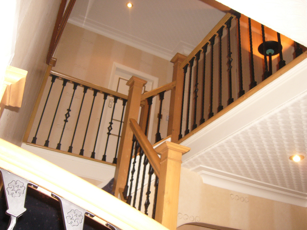 Balustrades infills in powder coated finish fitted to the existing timber newells and handrails to create an open staircase to this private residence in Wilmslow, Cheshire.